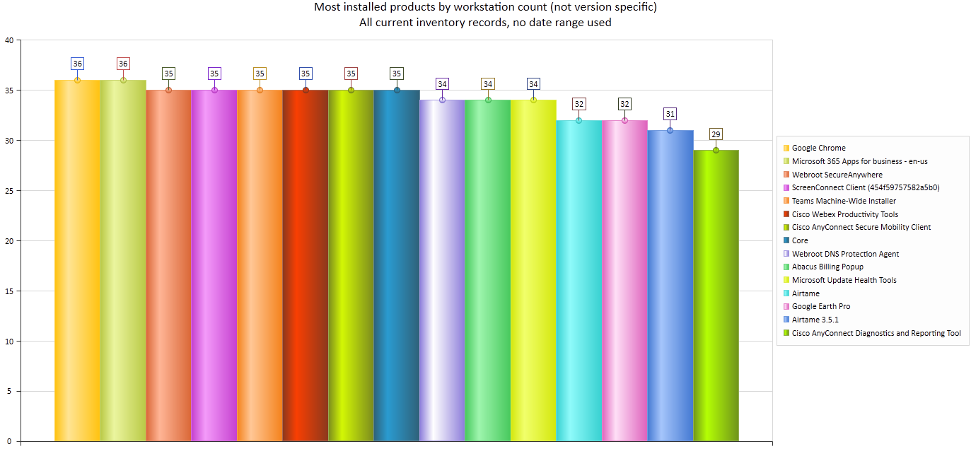 Essential details are automatically gathered, customizations are unlimited. For example, indication of who installed a workstation (or application) and when, purchase history, connected devices (via manual entry) such as printer, scanner, KVM device, UPS, and so on can all be entered and tracked. Any required detail can be added via a custom column(s). Non-digital devices can also be added, chairs, tables, supplies and more. Additionally, any software can be manually added, for instance, planning for budgets or software not currently installed.