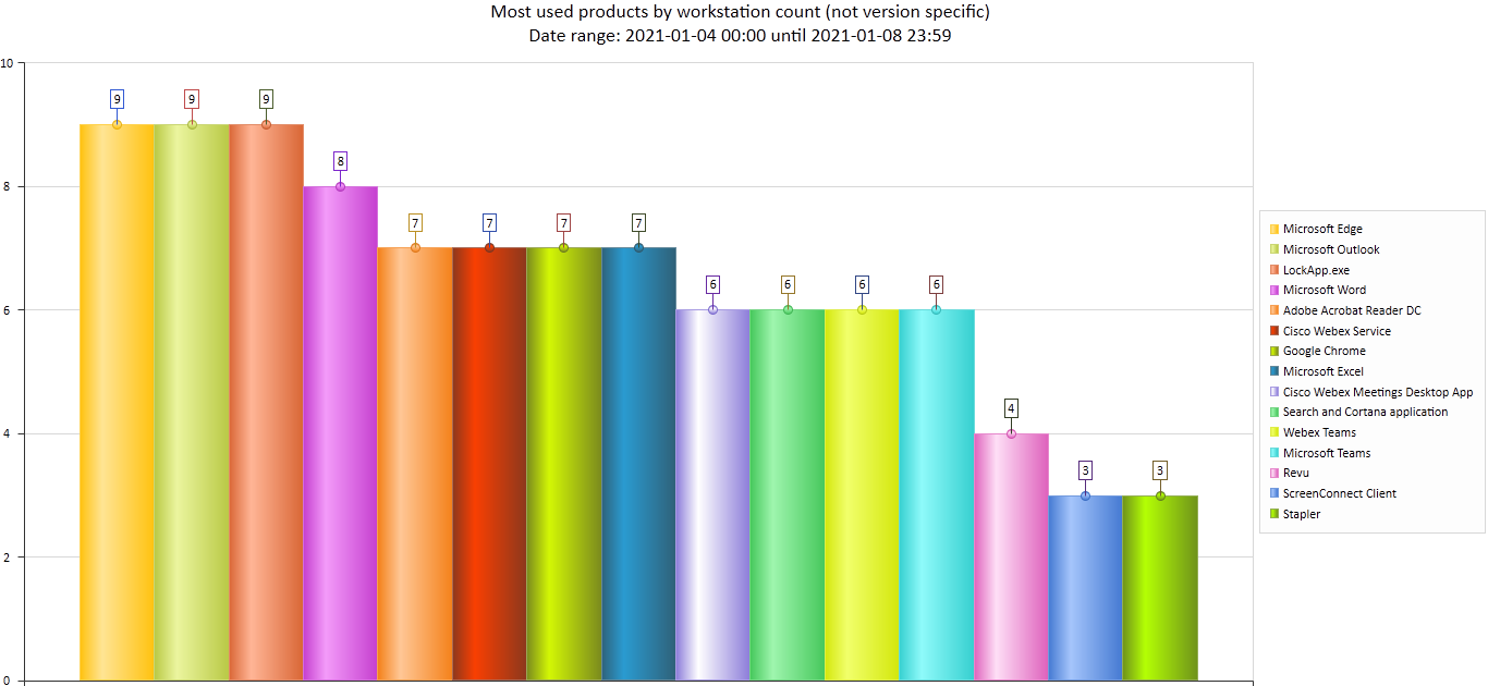 By continually collecting software usage details, SofTrack Managed Assets provides you with mutliple abilities to profile your software usage. The following will be available for each software application used by any user on any workstation or RDS(remote desktop session) in your environment: