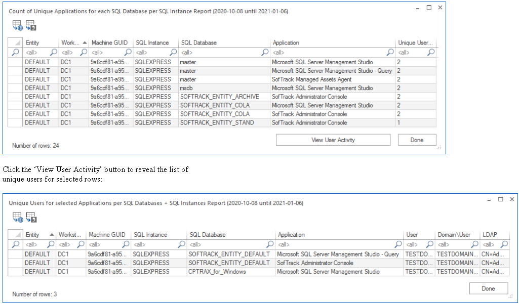 The following shows a sample SQL Logon Activity Report. This report provides details of each user logon including workstation name, SQL Instance, SQL Database and Application used.