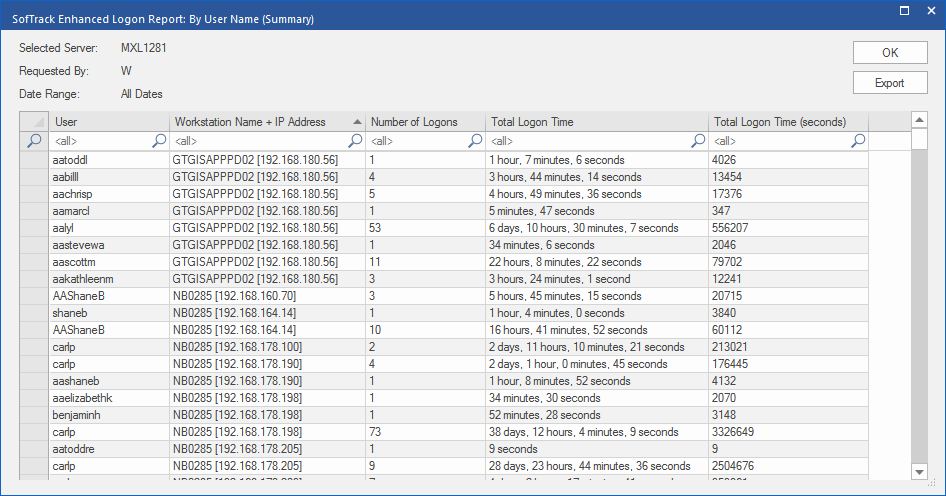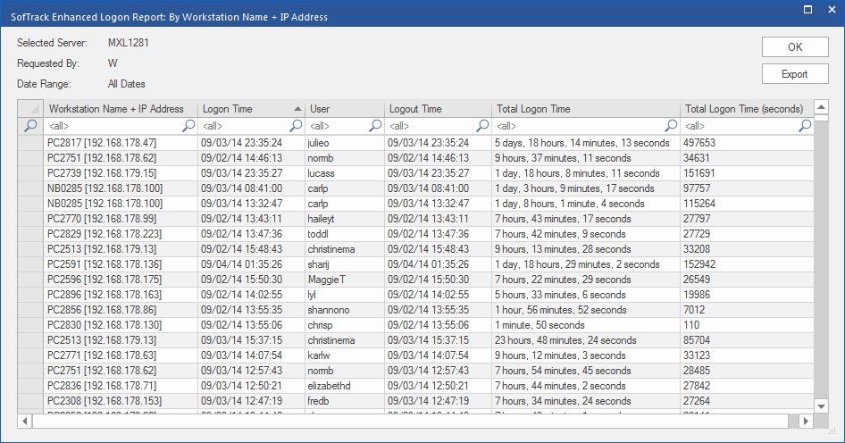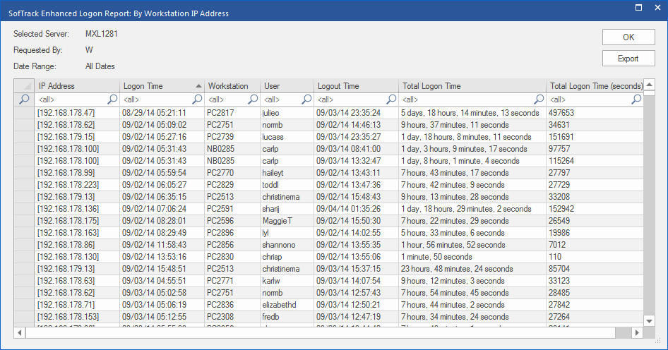 The following shows a sample detail Logon Report by User Name. This report provides details of each user logon including workstation name and IP Address.