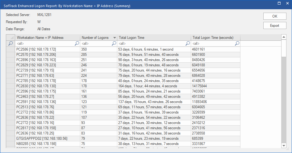 The following shows a sample summary Logon Report by Workstation Name + IPv4 Address. This report provides a summary of all logons within a selected date range. User name is not included in this specific report.