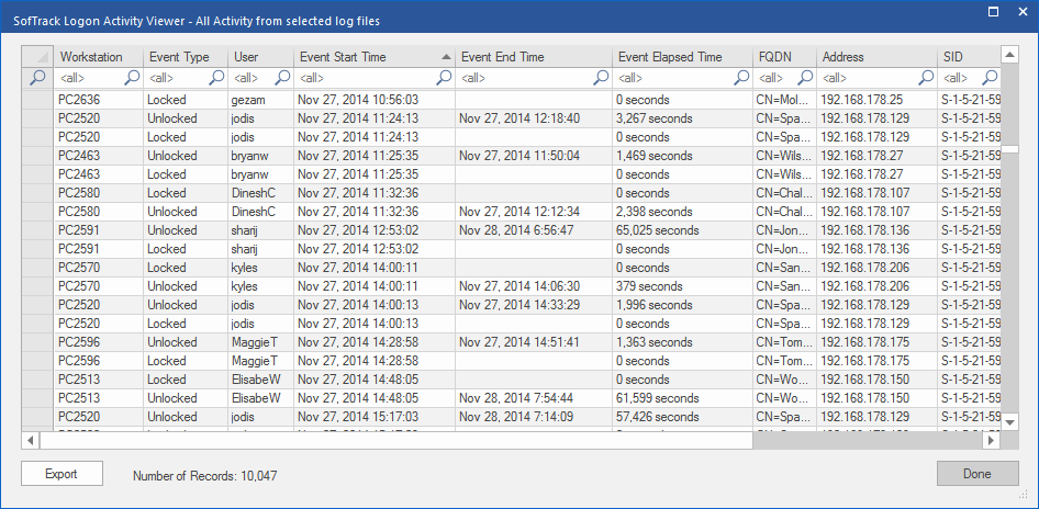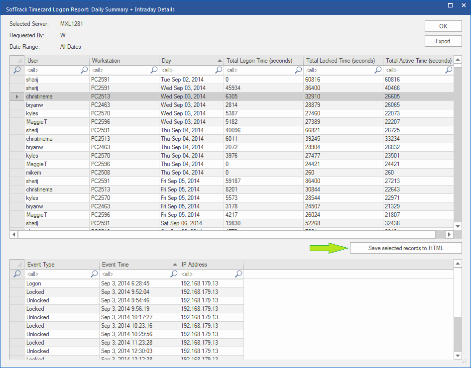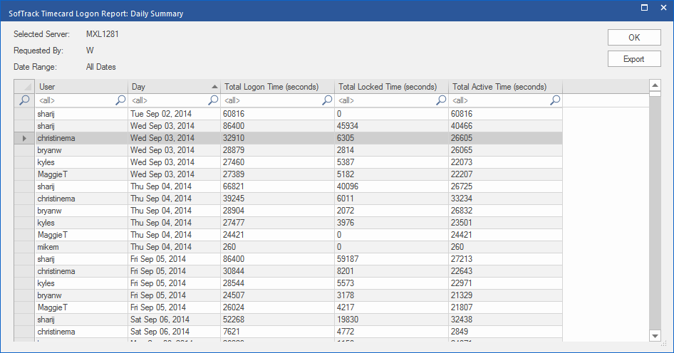 Here, each record is the daily summary of all active and inactive (locked) time by the username shown.