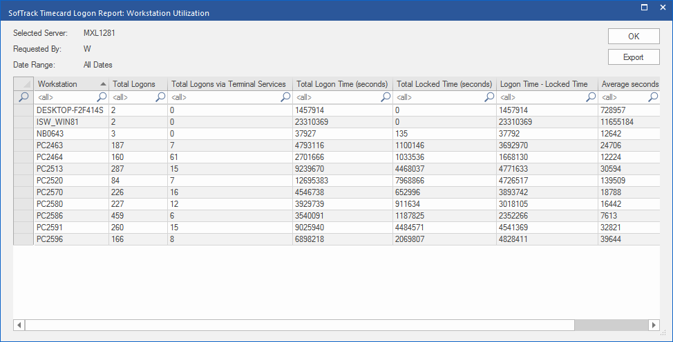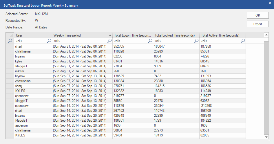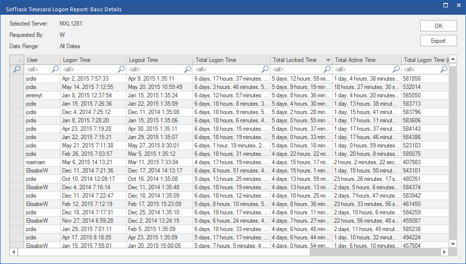 If the user logged on to multiple machines during the report time period, all active and inactive (locked) time data for that username are combined into a single record as shown in the image above.