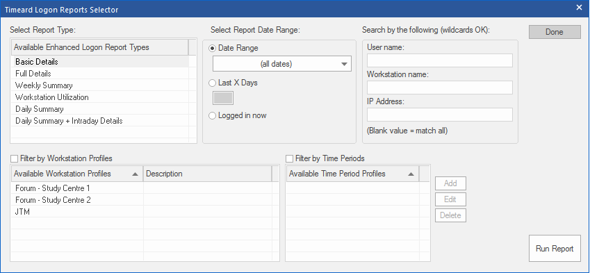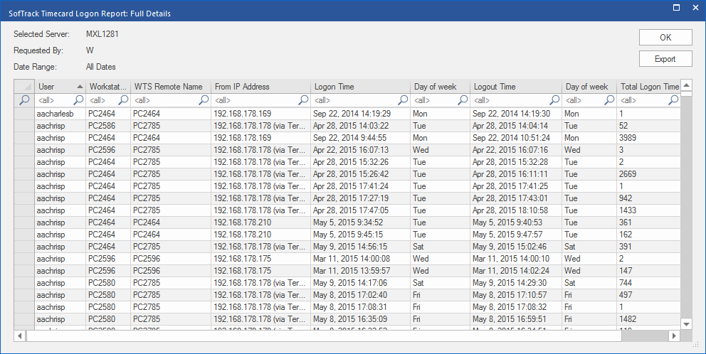 The following image shows a sample Full Details Timecard Report. This report includes user name used for logon as well as revealing the workstation details (name, IP address and terminal service remote name).