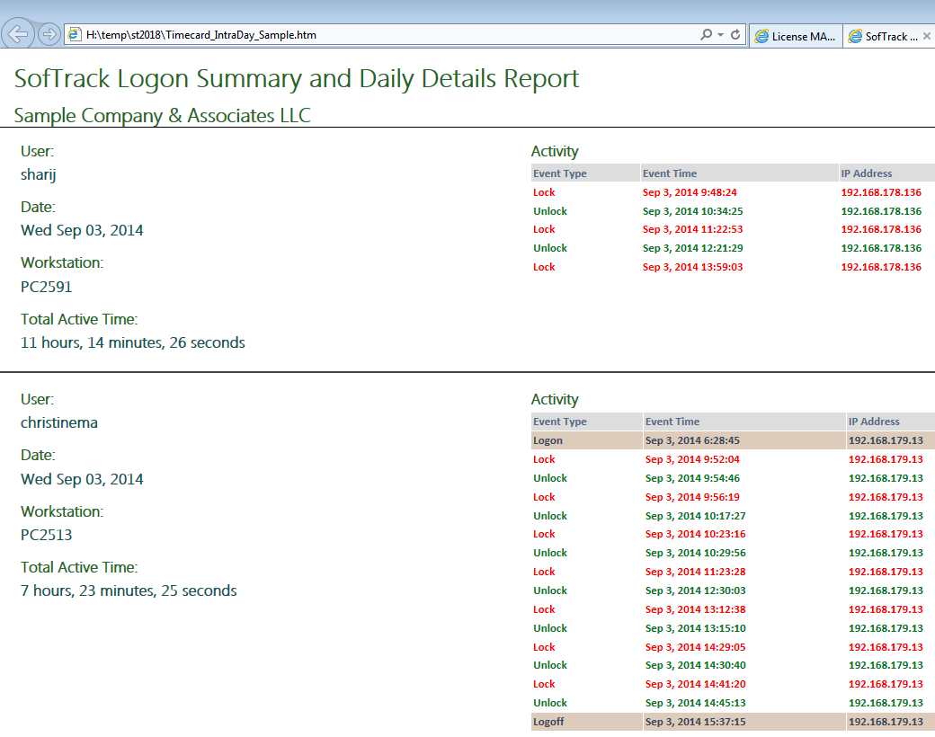 The following shows a sample Daily Summary per User plus Intraday Details Timecard Report. This report focuses on the user name per workstation used for logon.