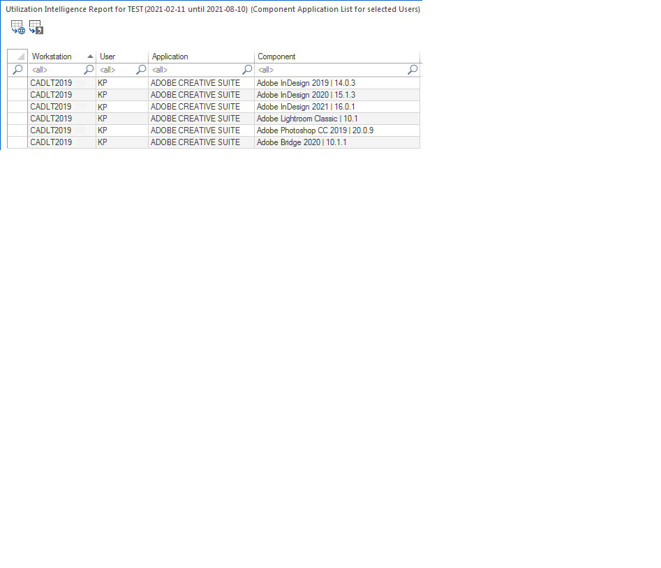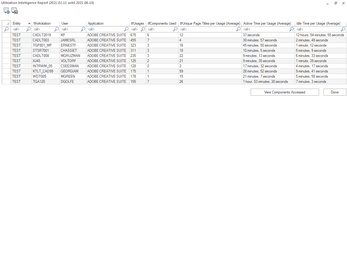 The number of components used value indicates the number of different applications, including different application versions are accessed. For example, if a Software Category is defined for Adobe Creative Suite®, you can quickly learn the number of components within that suite are accessed. The specific list of components (specific applications) accessed is available directly in the report.